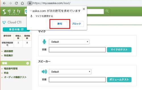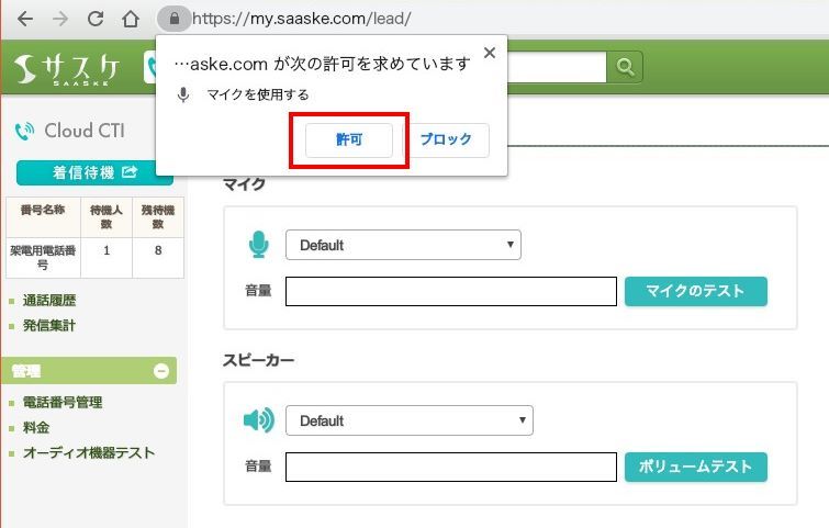 「オーディオ機器テスト」を開いた際に表示される『…aske.com が次の許可を求めています』のポップアップは必ず「許可」を選択してください。