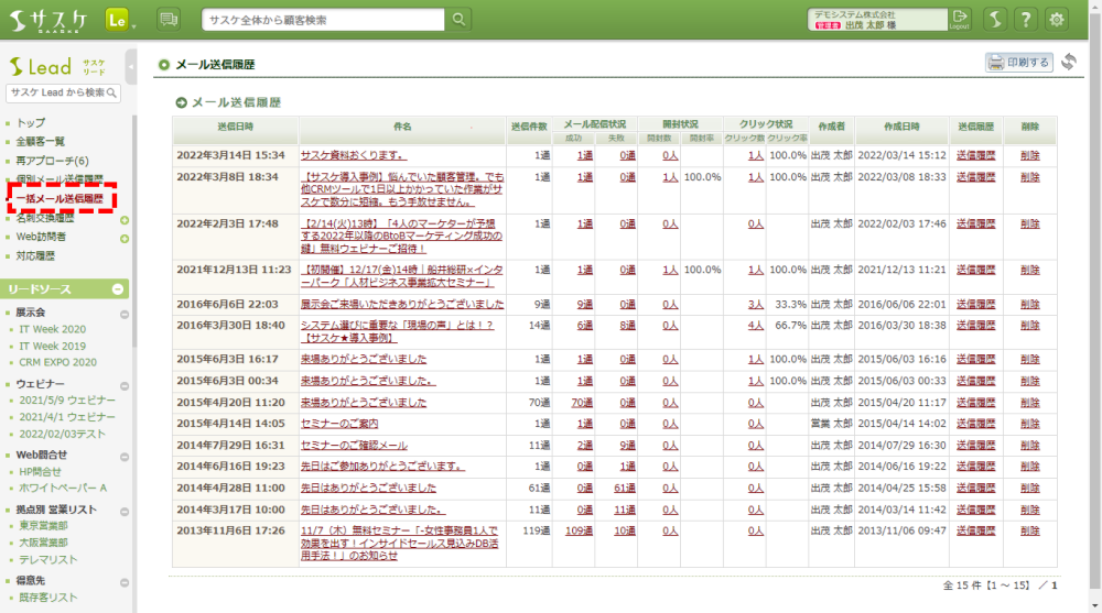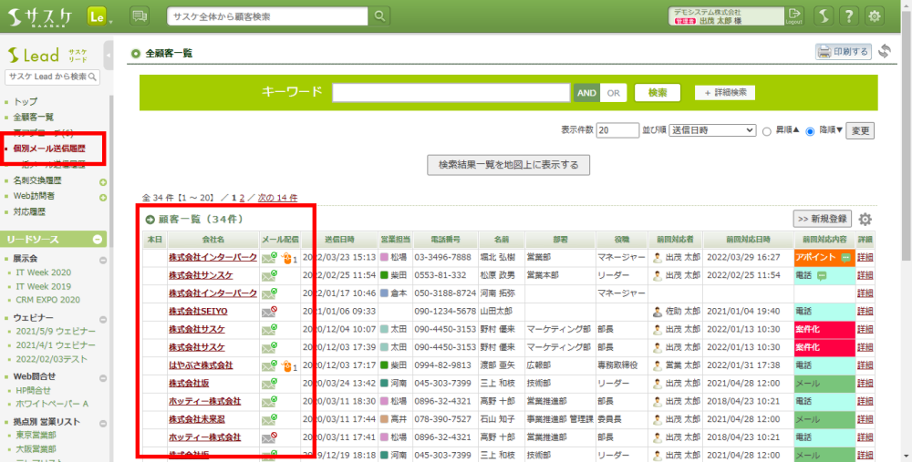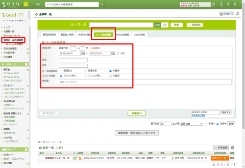 Lead 2022/03/30 サスケLeadのアップデート【「個別メール送信履歴」の検索機能】 アップデート 2022/03/30、サスケLeadがアップデートしました。「個別メール送信履歴」の検索機能いままで個別メールを一覧で見ることができませんでしたが、本日のアップデートにより一覧での閲覧が可能となりました。 「個別メール送信履歴」にてできること通常の検索は勿論のこと、送信日や件名、本文での検索、メール配信状況やクリック状況、送信者での検索が行えるようになりました。 以前あった「メール送信履歴」は?いままでのメール送信履歴は「一括メール送信履歴」として残っておりますのでご安心くださいませ。 よろしくお願いします。