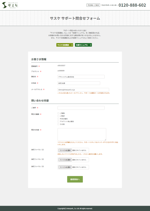 主に変わった点としましては、サスケ内の問合せフォームではなくサスケのWebフォームを利用した問合せフォームとなりました。また、それに伴い「問合せ種別」を選択し、必要があれば「添付ファイル」でスクリーンショットや動画を弊社までお送りすることが出来るようになりました。
