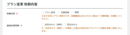 こちらで『お見積もり(まだプラン変更しない、あくまで相談)』もしくは『プラン変更依頼(既にアップ・ダウンさせる事が確定している)』を選択する事が出来ます。もし正式でない場合は「見積依頼」または「質問」を選択してください。