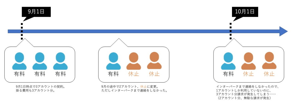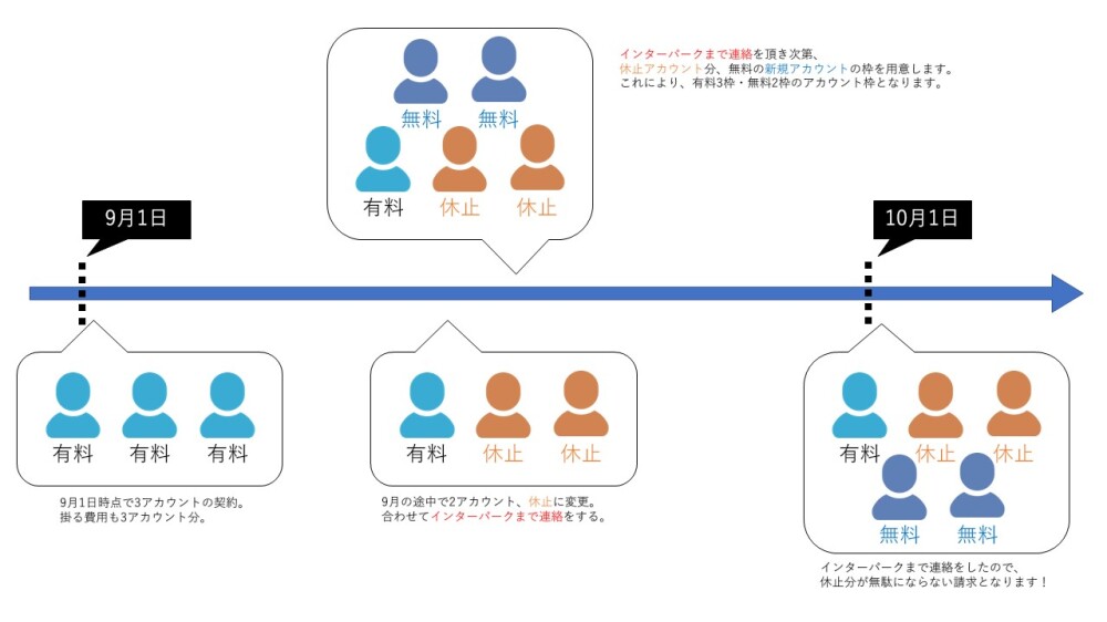 例えばですが、9月1日の時点では【利用中のアカウント3件】あったが9月の途中で【2件分を休止(1件利用中)】に変更した場合、インターパークまで連絡をしないと【10月の請求で3件分の請求が発生】します。つまり、休止にした2アカウント分無駄な請求が発生してしまいます。