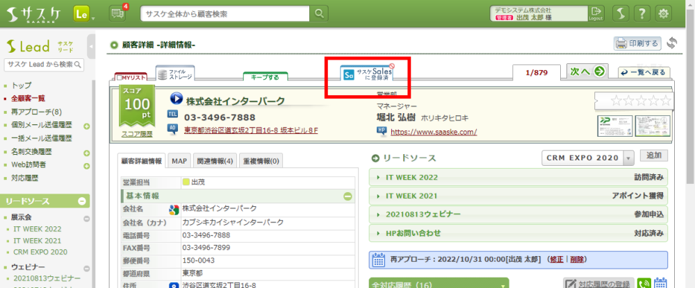 Lead 2022/10/27 サスケLeadのアップデート【「Sales連携済み顧客」の検索機能】 アップデート 2022/10/27、サスケLeadがアップデートしました。「Sales連携済み顧客」の検索機能サスケLeadの詳細検索内の顧客基本情報タブに「Sales連携」の検索枠が新たに追加されました。 「連携済み」で検索することで「サスケSalesに登録済」の顧客を検索することができます。また「未連携」で検索することでまだSalesに送ってない顧客だけを検索出来ます。 ぜひ、ご活用下さい。