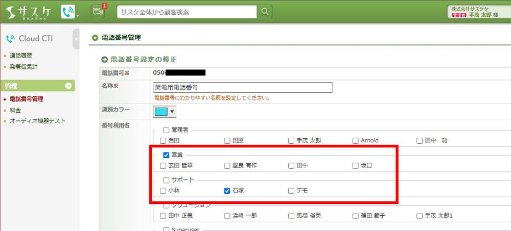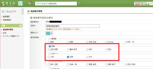 Cloud CTIに入り「電話番号管理」に入り、使わせたい電話番号の「修正」を開きます。すると「電話番号利用者」にチェックが入って無い箇所があります。ここで電話を使わせたいユーザーにチェックを入れて保存してください。