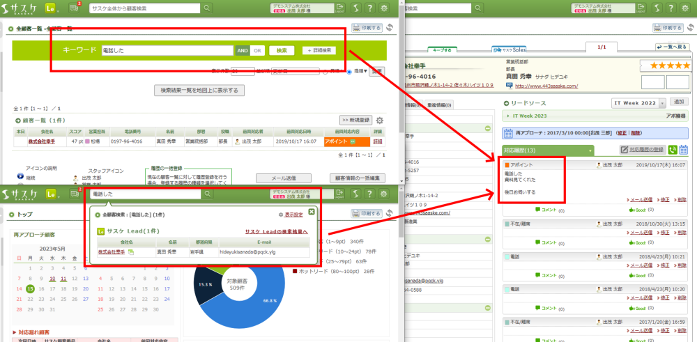 サスケLeadの対応履歴では「対応メモ」を、サスケSalesの活動履歴では「メモ」を、テレアポ職人の対応履歴では「通話メモ」を、残す事ができるようになっております。