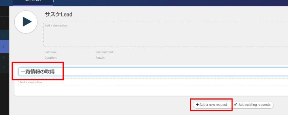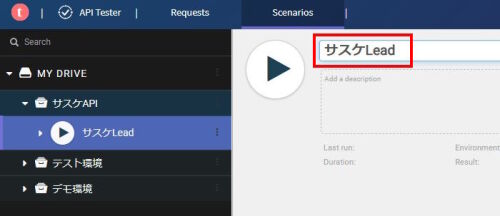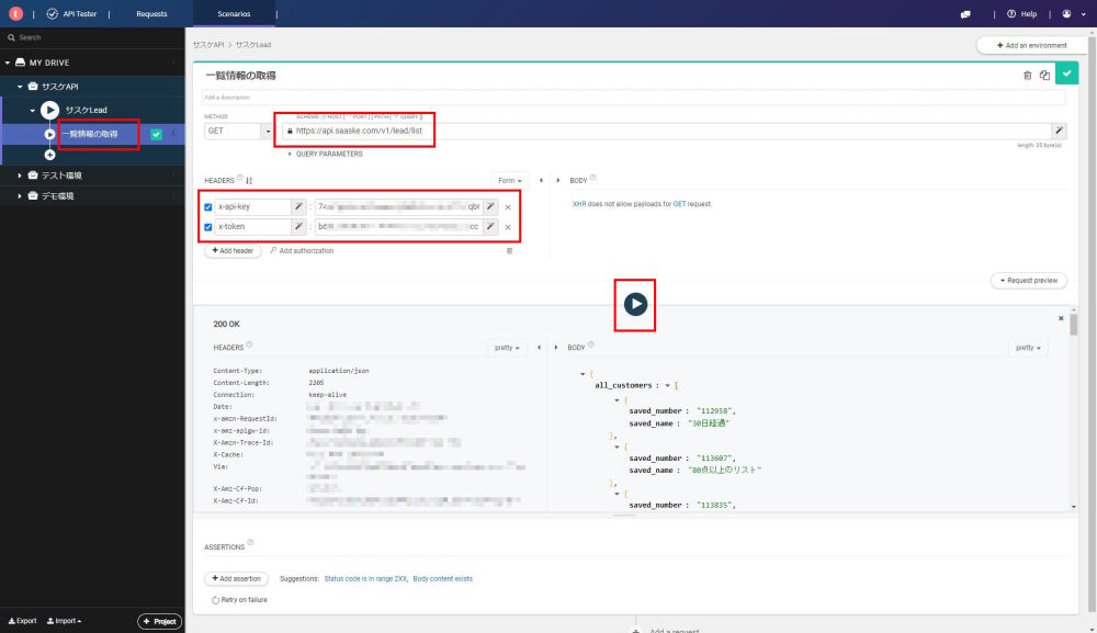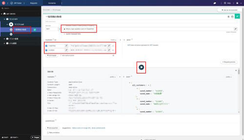 左メニューに先ほど登録した「一覧情報の取得」が表示されているので選択し、一覧情報の取得に必要な情報(URI・APIキー・トークン)を設定します。設定が完了したら「再生ボタン」をクリックすることで、APIの結果が右下のBODYに表示されます。