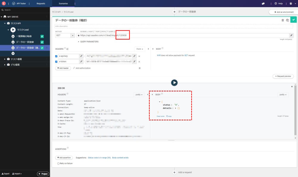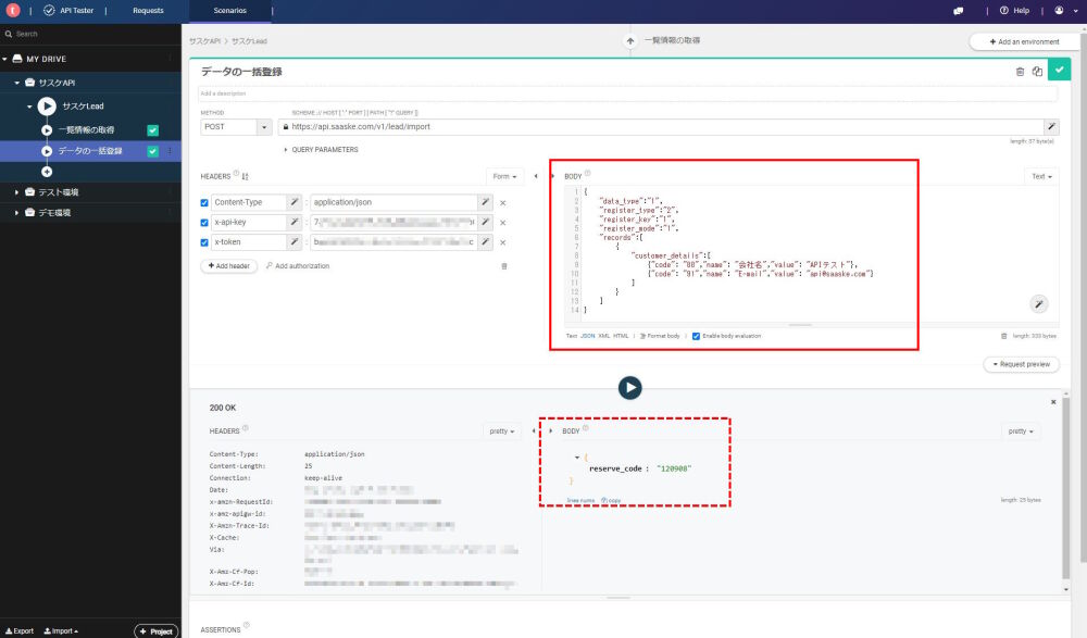 左メニューの「+」アイコンをクリックすると、Add a new requestと同じ動作が行えますので、新たに動かしたいAPIを新規登録します。今度は『データの一括登録』を試したいので、名称と一括登録に必要な情報(URI・メソッド・APIキー・トークン・BODY)を設定し、再生ボタンを押してみます。無事、結果のBODYに予約された番号が返却され、問題無く動作したことが確認できました。