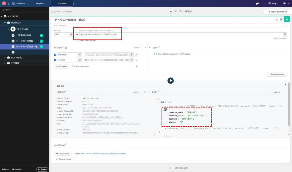 更にAPIを新規登録してきます。登録が完了したので、一括登録の確認が行えるか試してみます。『データの一括登録(確認)』の名称と取得に必要な情報(URIと予約番号・APIキー・トークン)を設定し、再生ボタンを押す事で予約状況が返却されました。