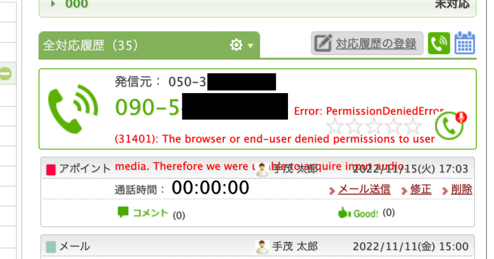 ブラウザまたはエンドユーザーが、ユーザーメディアへのアクセス許可を拒否しました。そのため、入力音声を取得することができませんでした。