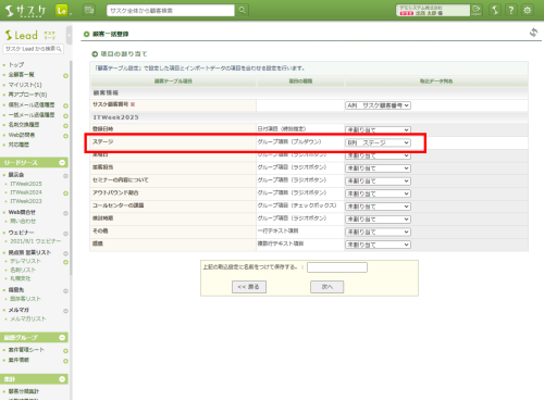 まず初めに、左メニュー「リードソース設定」を開き、インポートしたいリードソースの「履歴項目設定」を開きます。