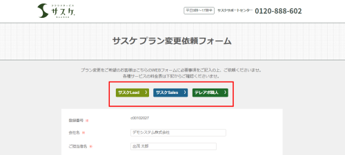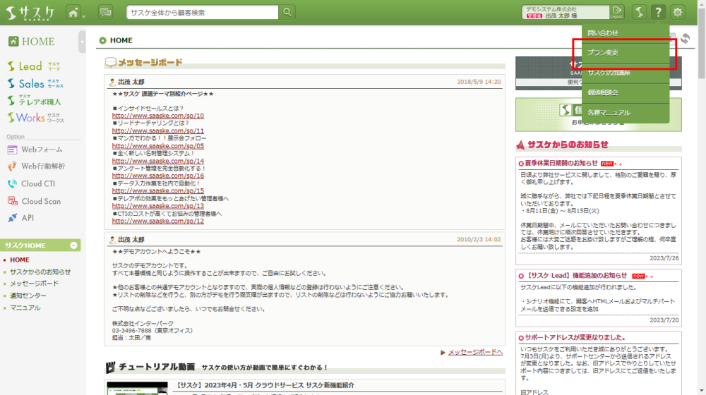 Lead、Sales、テレアポ職人、Webフォーム、Web行動解析、Cloud CTI、Cloud Scan、API 2022/12/26 各種サービスの料金を知りたい サスケのサービス料金は下記の操作で確認する事が出来ます。まず初めにサスケの右上「?」マーク内にある「プラン変更」をクリック。 その後表示されるフォームの上部に各サービスの料金表へのリンクがありますので、ご確認を頂けますと幸いです。 ※Webフォーム、Web行動解析は「Lead」のプラン表に載っておりますCloud CTIの料金につきましてはCloud CTIの通話料金についてをご確認ください。関連記事サスケのプラン変更専用フォームが設置されました|サスケ活用講座