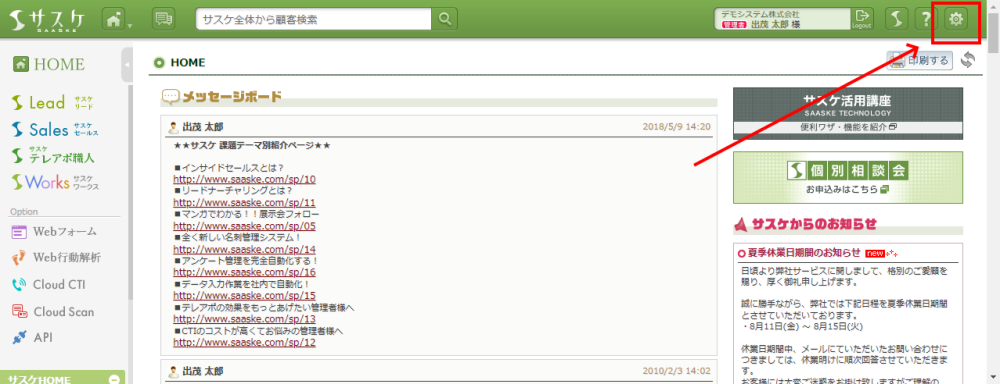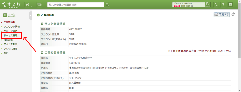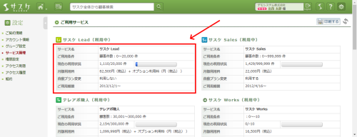 Lead、Sales、テレアポ職人、Webフォーム、Web行動解析、Cloud CTI、Cloud Scan、API 2022/08/25 現在のプラン件数を知りたい サスケに登録している件数、および上限を知りたい場合は下記の操作で確認ができます。サスケの右上「歯車」マークをクリック。 ご契約情報へ移動するので、左メニュー「サービス管理」をクリック。 サービス管理にて、各製品のご利用条件や現在の利用状況、月額利用料が確認できます。 関連記事サスケのプラン変更専用フォームが設置されましたCloud CTIの通話料金について各種サービスの料金を知りたい