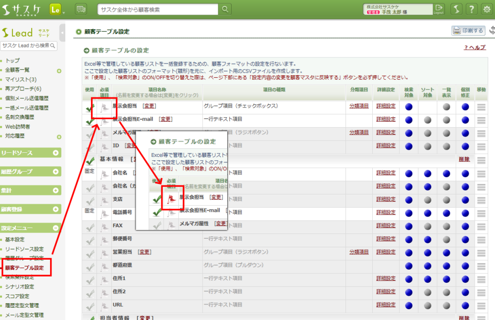 左メニュー「顧客テーブル設定」に入り、「グループ項目」の「必須項目」の旗を赤くするだけです。