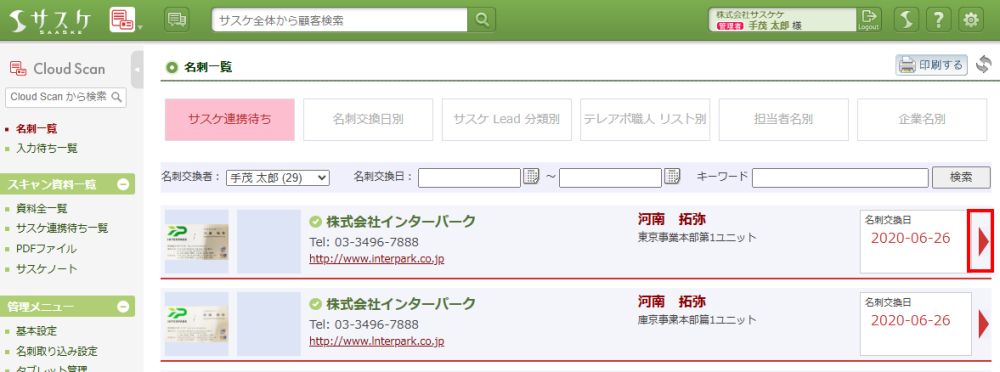 「サスケ連携待ち」に溜まった名刺情報は、下記の操作で手動で連携させることが可能ですのでお試し下さいませ。