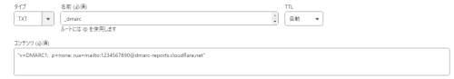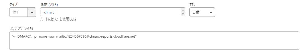 "v=DMARC1; p=none; rua=mailto:集約レポートを受信するメールアドレス"これで設定は完了となります。