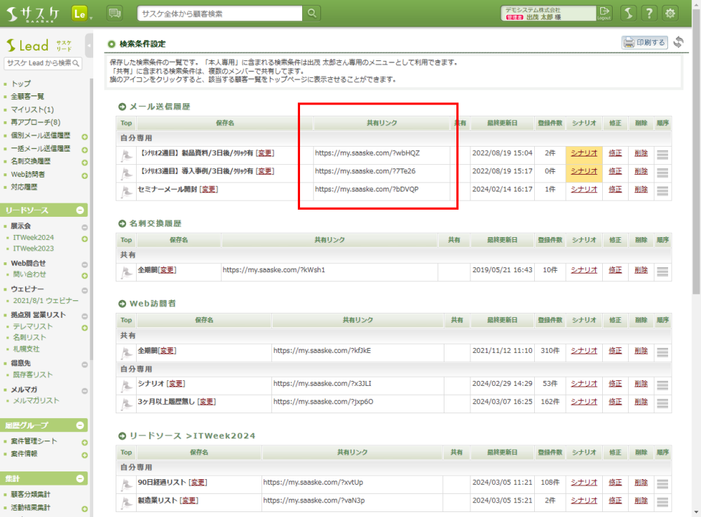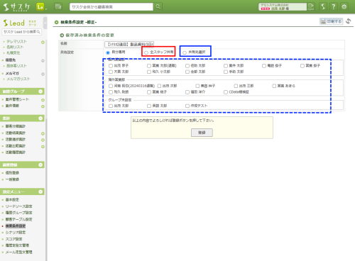 ユーザーの場合は検索条件を共有することができません。これは検索条件が乱立するのを防ぐ為です。