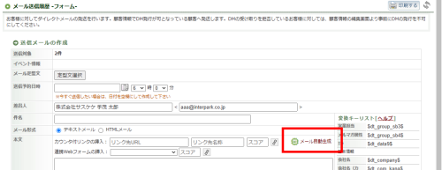 一括送信メールもしくは個別送信メールの「送信メールの作成」画面を表示すると、本文に「メール自動生成」のリンクが表示されているのでクリックします。