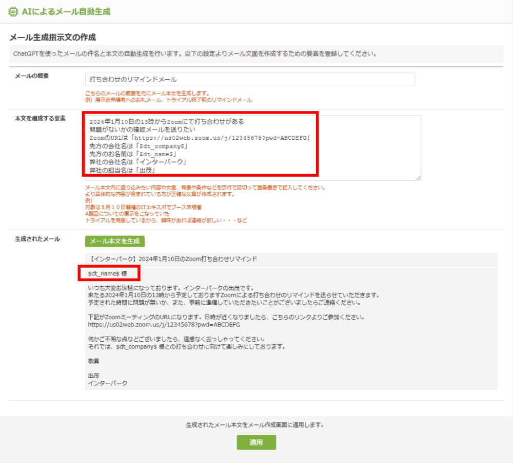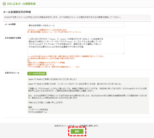 2~3分(ChatGPTの処理が多い場合は数分)お待ち頂くと、「生成されたメール」にメールの「件名」と「本文」が生成され表示されます。問題がなければ「適用」をクリックします。