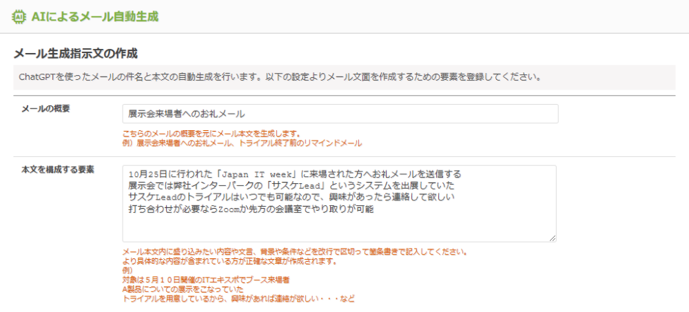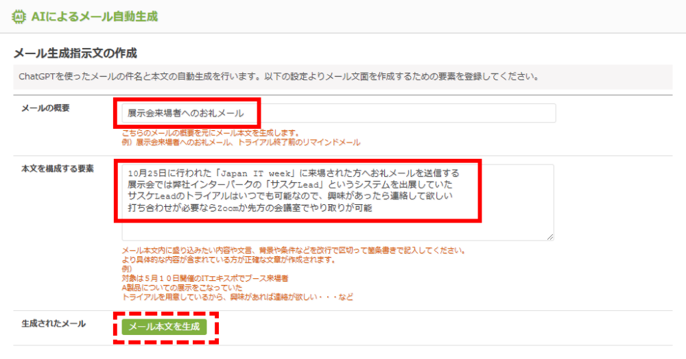 すると「AIによるメール自動生成」画面が表示されますので「メールの概要」と「本文を構成する要素」を記入し、「メール本文を生成」をクリックします。