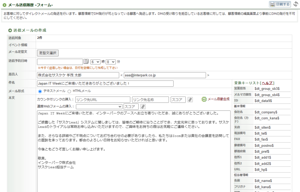 すると送信メールの作成に件名および本文にAIが作った文章が差し込まれますので、手修正を加えたりして送信するだけとなります。
