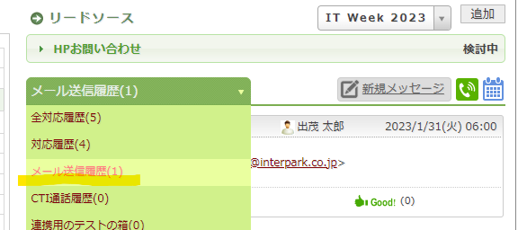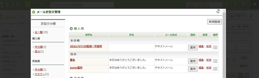 Lead 2023/11/30 個別メールで定型文を利用する方法 サスケの仕様について、アップデート、困ったとき サスケLeadでは「メール定型文管理」という機能がございます。この機能は個別送信メールでも活用できますのでお試し下さいませ。操作方法「全対応履歴」をクリックし、「メール送信履歴」へ切り替えて頂く。 「新規メッセージ」をクリックすることで、メールの作成画面(新規メッセージ)が表示される。 新規メッセージ内に「定型文選択」ボタンが表示されるのでクリックする。 作成済みの定型文が表示される。 「適用」ボタンをクリックすることで、定型文が反映されます。