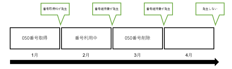 - 3月の中旬に該当番号を削除した場合、3月末に「番号維持費」が発生し、翌月からは発生しない