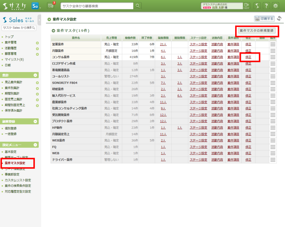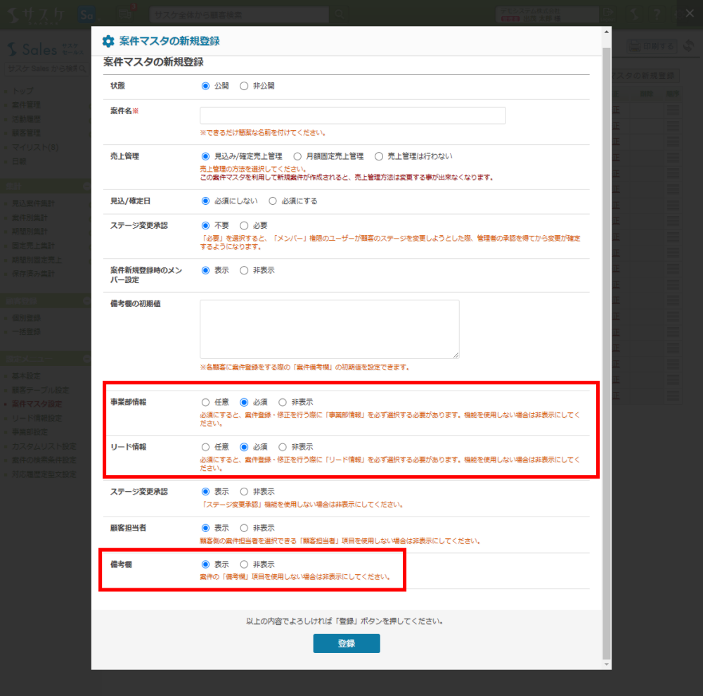 Sales 2024/03/28 サスケSalesのアップデート【案件の「事業部情報」「リード情報」の必須化機能】 アップデート 2024/03/28、サスケSalesがアップデートしました。案件の「事業部情報」「リード情報」の必須化機能案件の新規登録もしくは修正時に「事業部情報」および「リード情報」を必須にできる新機能を追加いたしました。それに合わせて、該当の2箇所および「備考欄」を非表示にする仕組みも追加しております。 設定方法左メニュー「案件マスタ」へ入り、「案件マスタの新規登録」もしくは「修正」にて変更が可能です。 連動箇所は以下の通りです。