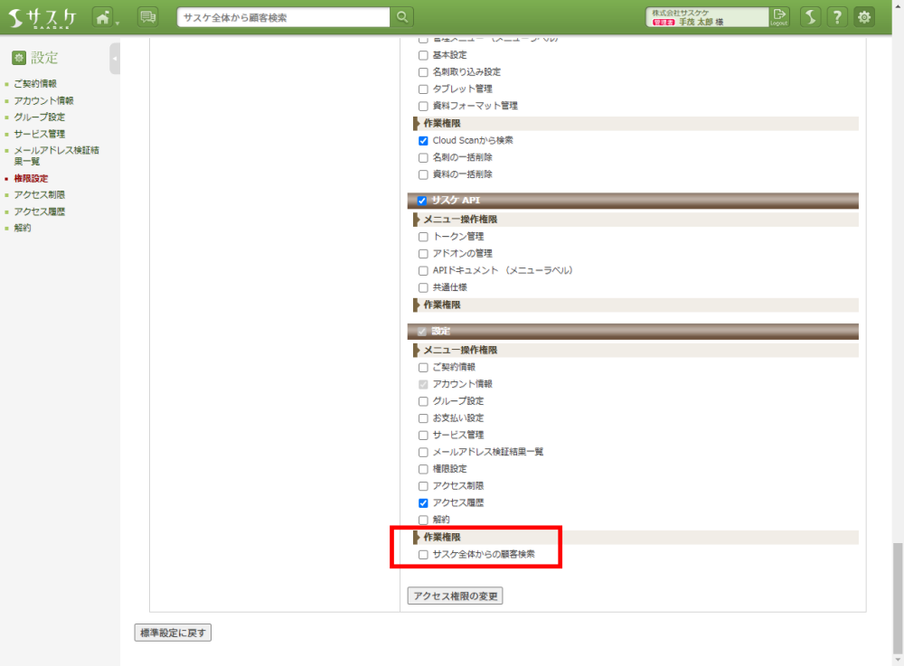 Lead、Sales、テレアポ職人、Webフォーム、Web行動解析、Cloud CTI、Cloud Scan、API 2024/08/05 サスケのアップデート【「サスケ全体から顧客検索」の権限機能】 サスケの仕様について、アップデート 2024/08/05、サスケがアップデートされました。「サスケ全体から顧客検索」の権限機能今までのサスケではヘッダー(上部)に表示されている「サスケ全体から顧客検索」は全てのサービスを通して検索が行えます。しかし権限で表示を制御したい場合はこの機能がネックでした。 今回実装された「サスケ全体から顧客検索」の権限を外すことで 上部に表示されている検索ボックスが消える仕様となりました。