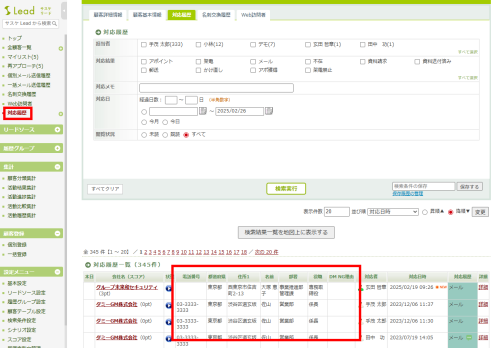 代わりにですが、サスケLeadであれば左メニュー「対応履歴」より『サスケに残した「対応履歴」』を検索することができます。また「顧客テーブル(顧客詳細情報)」の情報を一覧に表示されることが可能となっております。