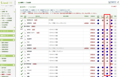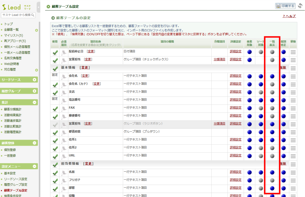 左メニュー「顧客テーブル設定」より「一覧表示」をONにした項目が該当致します。