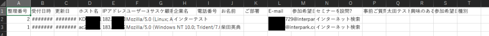 Webフォームへ記入されたお客様のグローバルIPアドレスが保存されています。