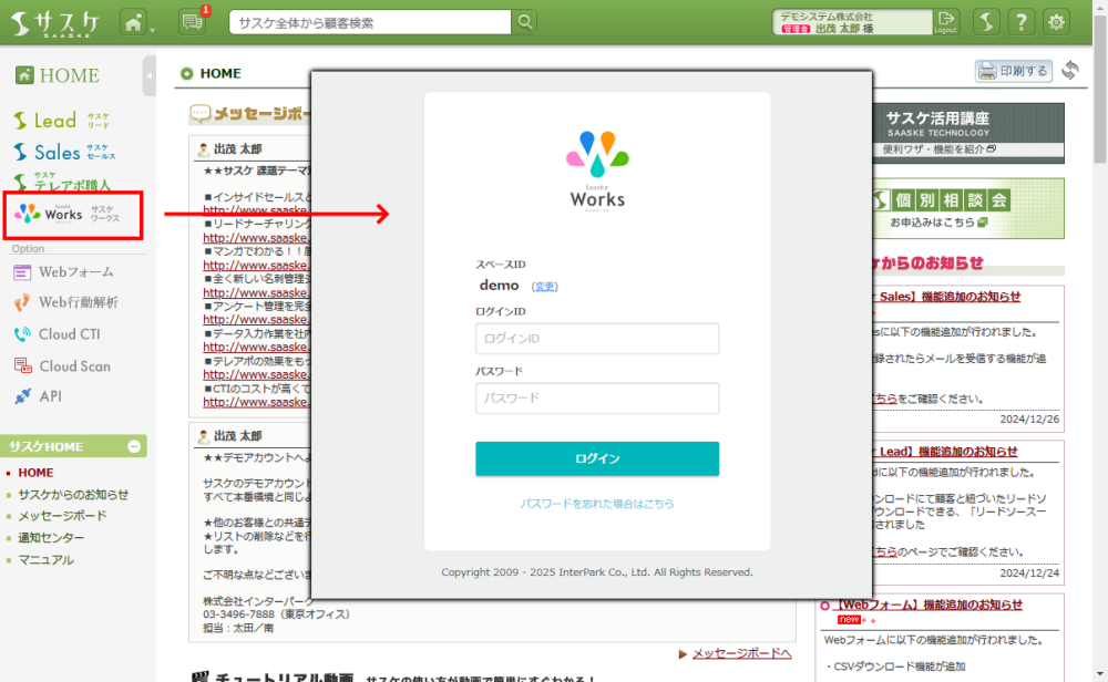 Lead、Sales、テレアポ職人、Webフォーム、Web行動解析、Cloud CTI、Cloud Scan、API 2024/12/05 サスケのアップデート【WorksアイコンからWorksアプリへ直接移動するよう変更】 アップデート 2024/12/05、サスケがアップデートしました。WorksアイコンからWorksアプリへ直接移動するよう変更左メニューのWorksメニューから、Worksアプリへ直接移動するよう仕様が変更されました。サスケからWorksへより移動しやすくなっております。
