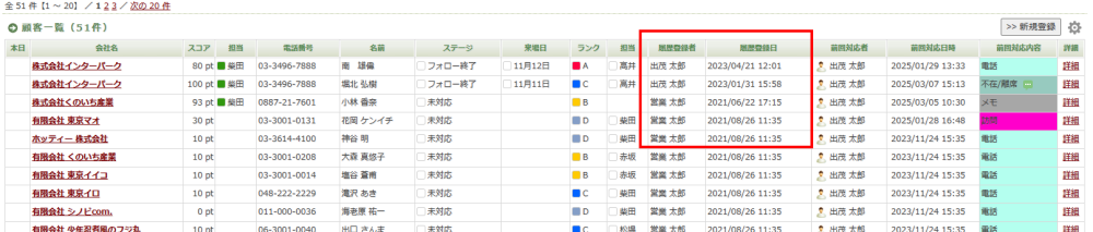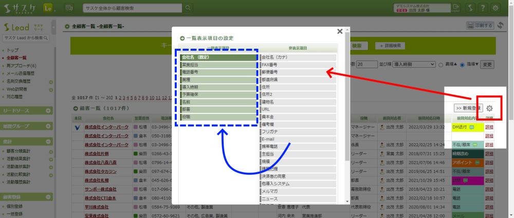 Lead 2025/03/19 サスケLeadのアップデート【リードソース・履歴グループの登録者/登録日を一覧表示機能】 サスケの仕様について、アップデート 2025/03/19、サスケLeadがアップデートしました。リードソース・履歴グループの登録者/登録日を一覧表示機能サスケの顧客一覧画面では、様々な情報をテーブルに表示されることができます。詳細:「一覧表示項目の設定」の個別設定機能この「一覧表示項目の設定」に『リードソースの登録者/登録日』および『履歴グループの登録者/登録日』を表示させることができるようになりました。 登録者/登録日 を表示させるにはリードソースおよび履歴グループの歯車マークをクリックし、追加することができます。 「一覧表示項目の設定」では『履歴登録者』および『履歴登録日』として表示されておりますので、こちらを左側へ移動していただけますと幸いです。