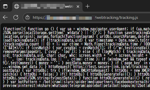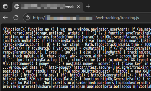 - アップロードが完了いたしましたら、念のため https://[お客様サーバのパス]/tracking.js へアクセスします。
