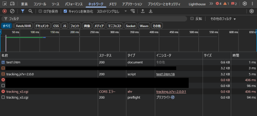 もし、デベロッパーツールのネットワークタブにて下記のようにエラーとなっている場合は トラッキング(アクセス解析)を行う事ができません。 その場合は以下の点をご確認ください。