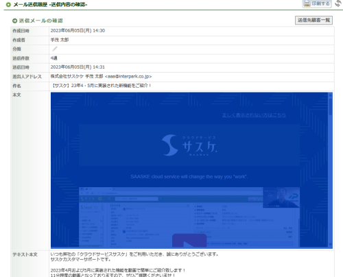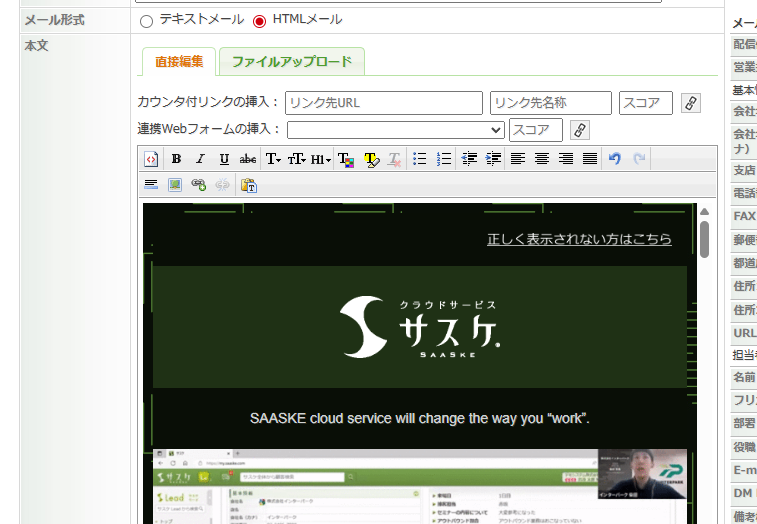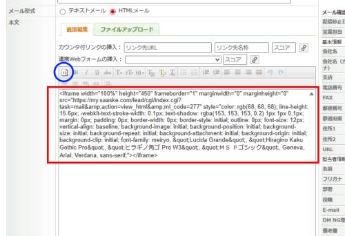 HTMLメールの内容を問題無く貼り付けられているように見えましたが、内部では iframe(外部ページを埋め込むタグ)になってました。この場合、サスケでは問題無く見えますがメールを受信すると表示されない状態となってしまいます。