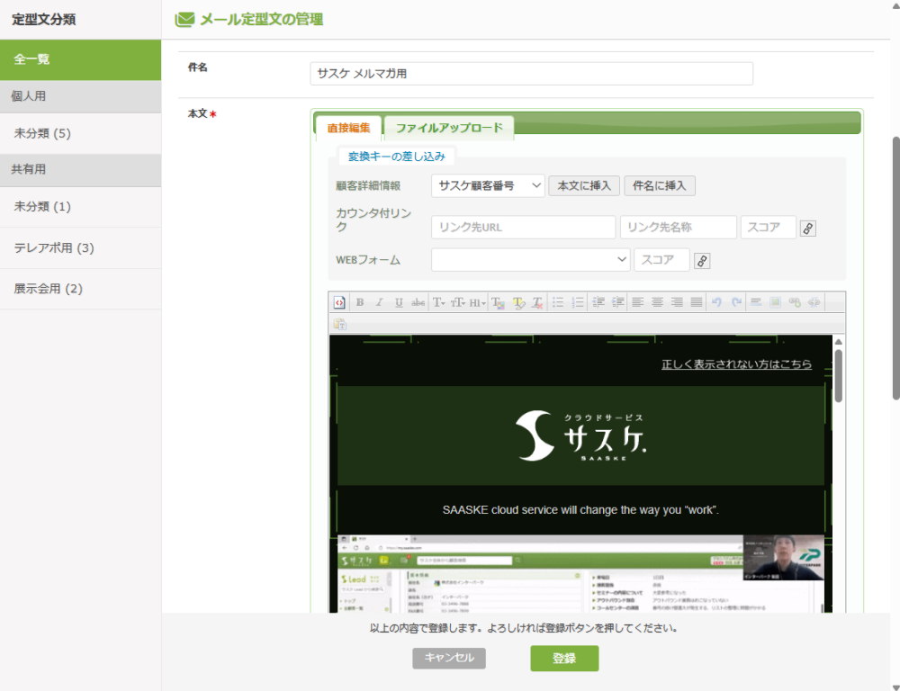メール定型文管理につきましては下記の記事を参考くださいませ。