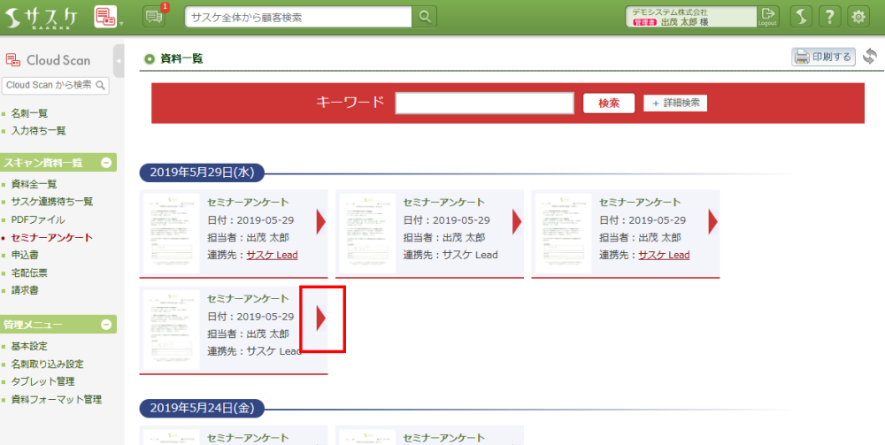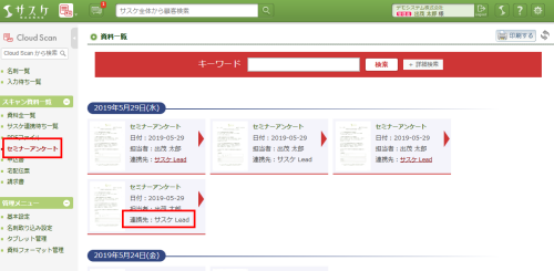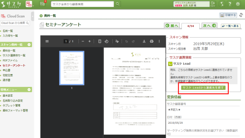 スキャン資料一覧にて「連携先:サスケ Lead」などがリンク化されてない資料が、未連携の資料となります。しかしこの方法では1つずつ見るしか無いため、1の方法が便利です。