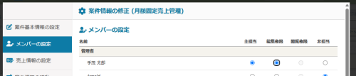 Sales 2025/05/15 案件の「詳細検索」で「主担当」に候補が出てこない サスケの仕様について、困ったとき 案件の「詳細検索」で「主担当」に表示されるアカウント名は、該当案件にて「主担当」もしくは「編集権限」を持っているユーザ名のみ、となります。 そのため、例えば適当な顧客の「案件詳細情報」に表示されております「修正」をクリックします。 そして「メンバーの設定」にて「主担当」もしくは「編集権限」を設定することで、該当箇所に表示されるようになります。