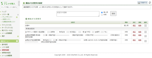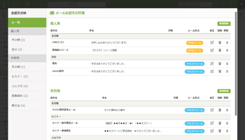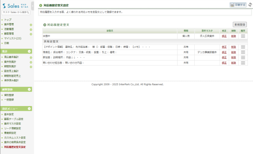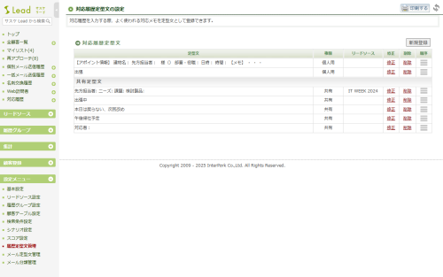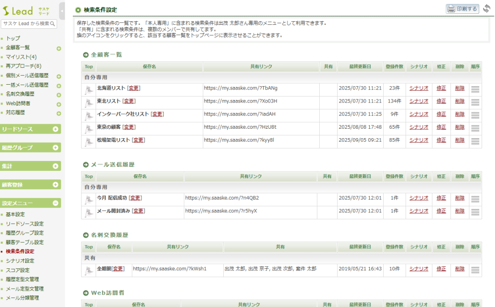 Lead、Sales、テレアポ職人 2025/06/12 管理者のみ「共有」の設定が行えます サスケの仕様について サスケでは検索条件や定型文などを全員と「共有」することができます。しかし、この共有は「管理者」アカウントでのみ行うことができます。管理者アカウント ユーザーアカウント どこで判断できる?|サスケ活用講座サスケのアカウント情報の追加・編集|サスケ活用講座管理者アカウントでのみ共有できる箇所サスケLead検索条件設定 履歴定型文管理 メール定型文管理 サスケSales対応履歴定型文設定 テレアポ職人定型文設定 検索条件設定